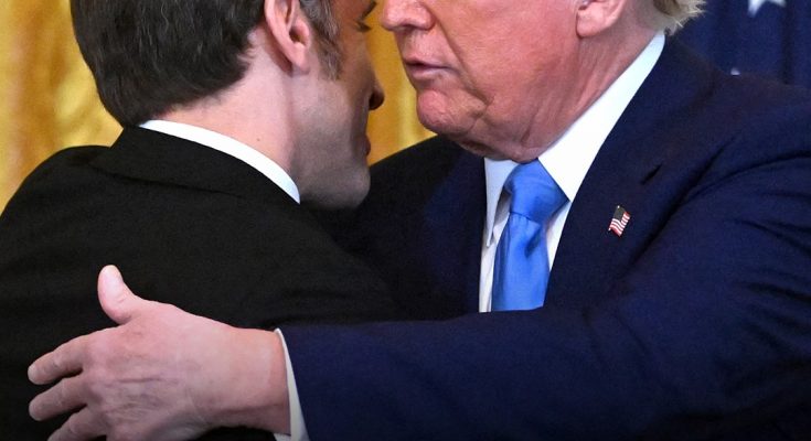 Emmanuel Macron and Donald Trump shaking hands and embracing in the East Room of the White House in Washington, D.C., on February 24, 2025. | Source: Getty Images