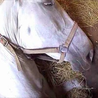 To his dismay, one of his horses, Freedom, had managed to escape from her stable and entered the garage, where her weight had broken through the wooden floor boards. She was now stuck, helpless, in a deep crate in his garage.