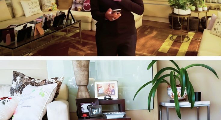 Inside, her penthouse is thoughtfully arranged, and decorated with cream sofas, decorative pillows, candles, and personal photos—each detail blending comfort with a touch of modern elegance.