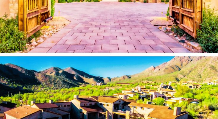 Textured stone walls and desert landscaping frame the welcoming entryway, blending rustic charm with modern elegance, and drawing guests into an exclusive sanctuary within the heart of the Arizona desert.