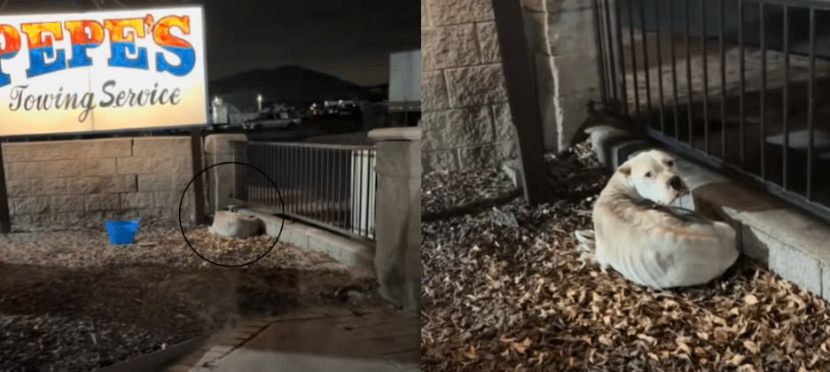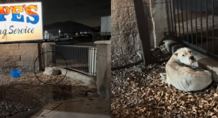 Upon arriving, Tera’s heart sank. Dojo was curled up beneath a large sign for Pepe’s Towing Service, his head resting on his paws, trying to stay warm. The sight was devastating. He was so thin that every bone in his fragile body was visible beneath his skin. His fur was patchy, and his eyes, once bright and full of life, were now dull and weary.