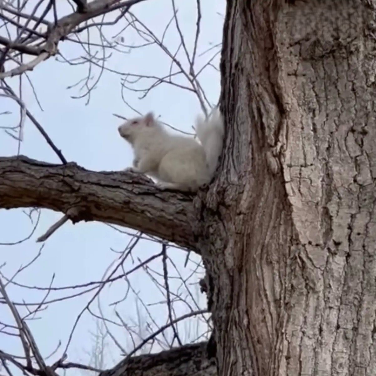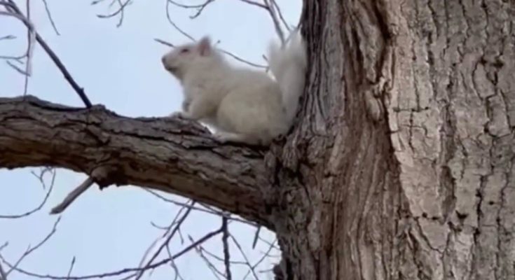 The other day, a Sioux Falls resident named Angela Stallinga was in her backyard when she spotted an unusual-looking animal in a nearby golf course’s tree. The animal had a squirrel’s fluffy tail and dexterous paws, but his fur was bright white.