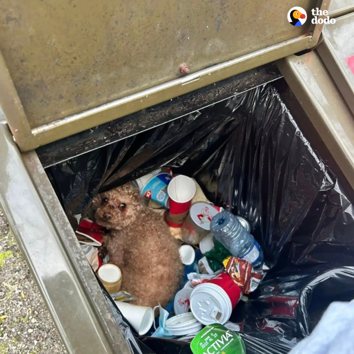 On a recent walk through Vancouver’s Pacific Spirit Park, animal lovers Terry Sparrow and Krista Brisk found something that made their hearts drop. While throwing his gum away, Sparrow noticed a figure moving inside the trash can. At first, he assumed it was a squirrel or a raccoon. But then, Sparrow looked closer and realized the truth — there was a fluffy brown dog buried beneath the garbage.