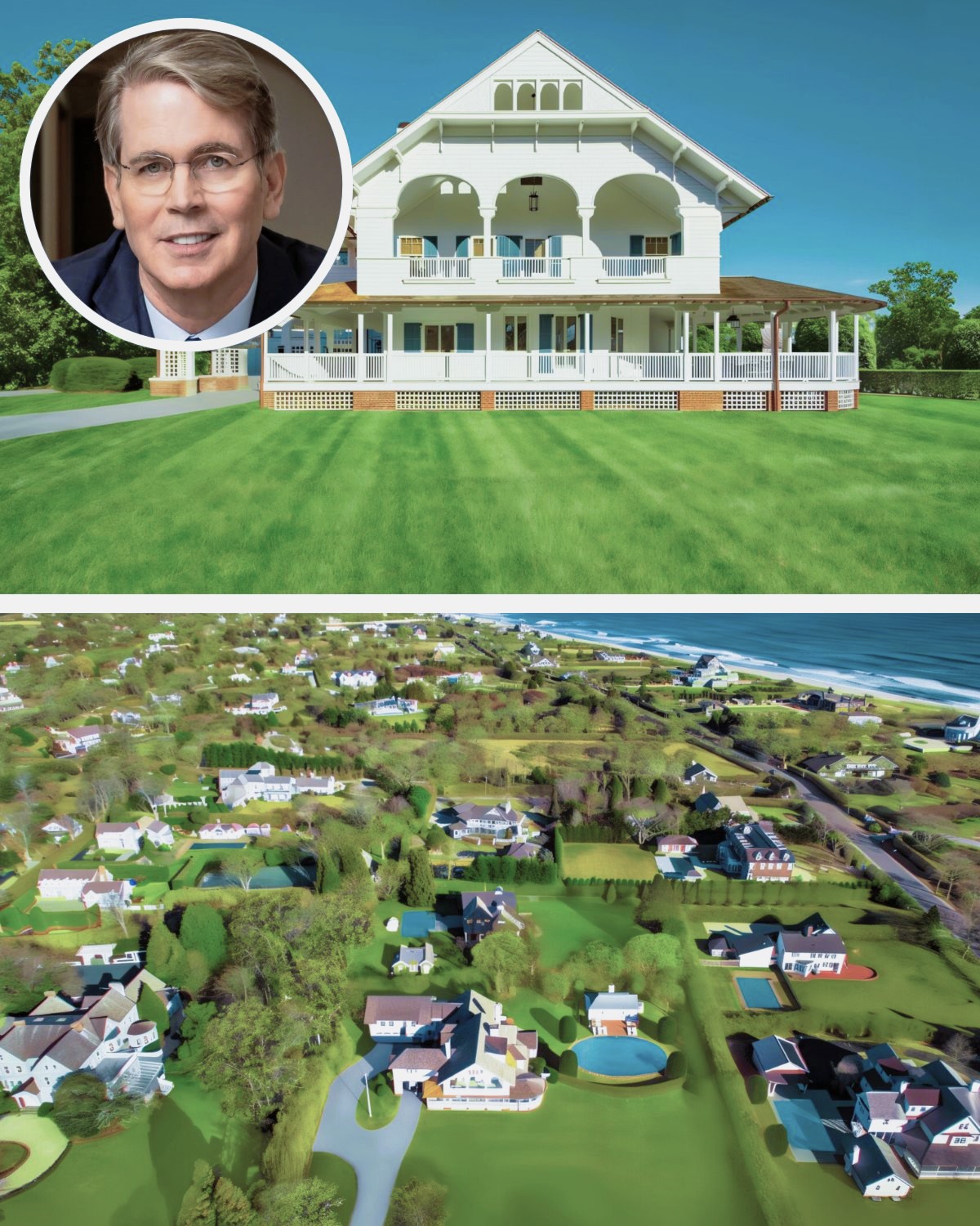 This aerial view showcases the estate’s magnificent grounds, surrounded by lush greenery and neighboring properties, all set against the backdrop of the ocean, creating a serene and exclusive atmosphere.