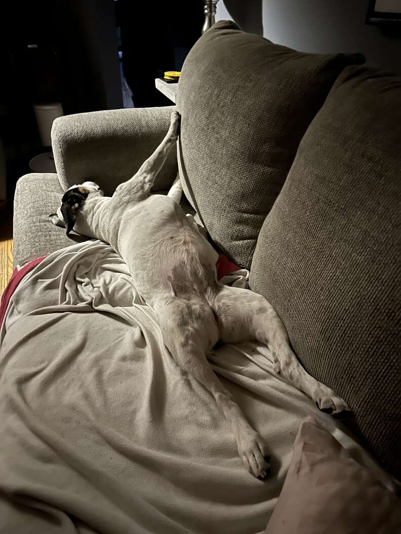 Rain initially was panting so hard she couldn’t sleep, but by the end of the night, she’d relaxed into the arms of her rescuer, sprawled on her back and comfy.