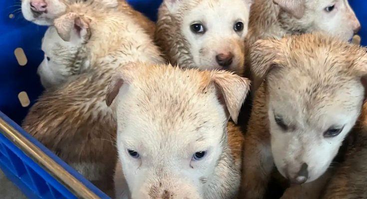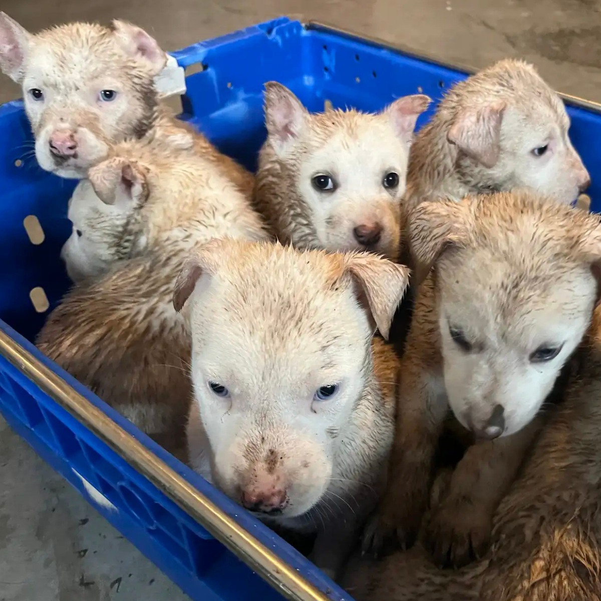 The previous night’s heavy rain had filled the crate with dirty water, turning the puppies’ white fur filthy. It was freezing outside, so the puppies had been huddling together, desperately trying to keep each other warm.