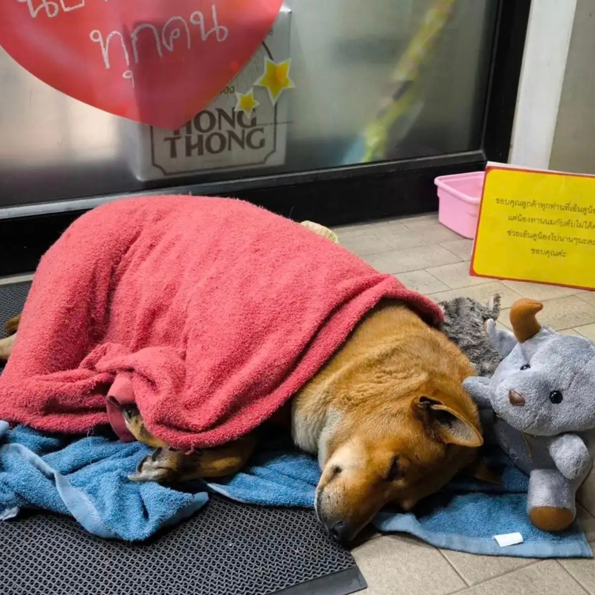 The dog, now apparently cared for by staff at the 7-Eleven soon went viral. And after talking to the owner of the store, Mari-Mo came to learn the bittersweet story of why the dog now rested there alone.