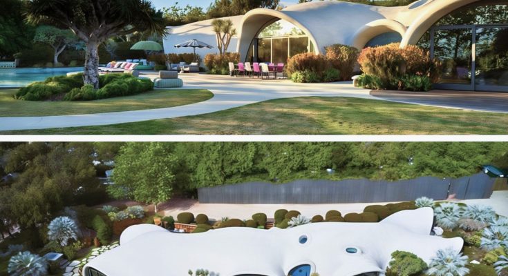 The exterior showcases the home’s bubble design, harmoniously blending with the surrounding gardens, creating an oasis that feels both futuristic and grounded in nature.