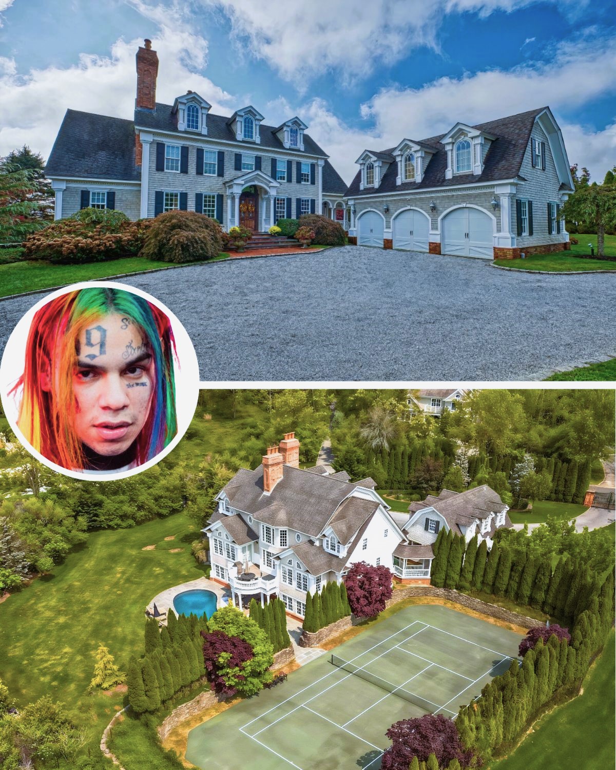 This traditional residence blends old-world charm with modern seclusion, providing an unexpected haven within Water Mill’s lush landscape, now celebrated for its connection to 6ix9ine.
