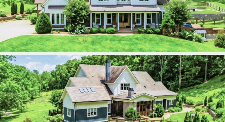 The exterior of Kristin Cavallari’s Tennessee estate features a charming, rustic design with a spacious covered porch offering serene views of the surrounding lush greenery.