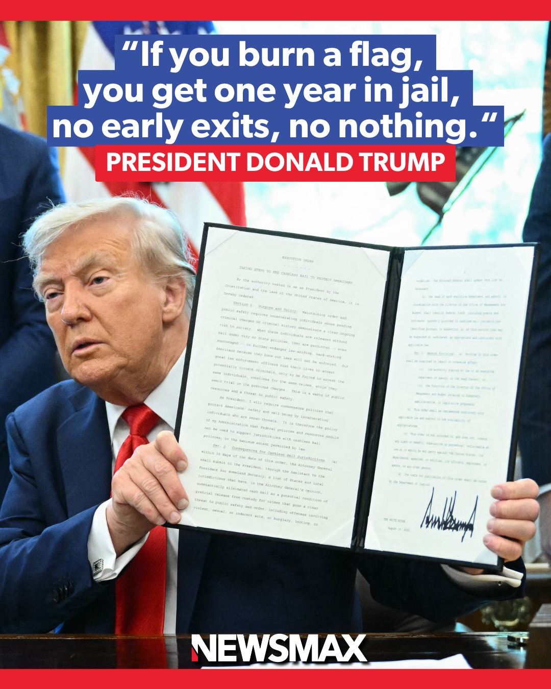 “If you burn a flag, you get one year in jail, no early exits, no nothing. You get one year in jail, and it goes on your record and you will see flag burning stopping immediately,” Trump told reporters in the Oval Office. “Some people would say it’s more important than protecting our monuments, because the people in this country don’t want to see our American flag burned and spit on by paid agitators.”
