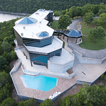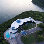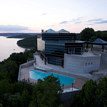 This abandoned lakefront glass home, dubbed “Crystal Palace”, is located at 650 Evergreen Lane in Branson, Missouri and is situated on over 365 acres of land on the banks of prestigious Table Rock Lake. It was the home of Robert W. Plaster, who founded Evergreen Investments, LLC.