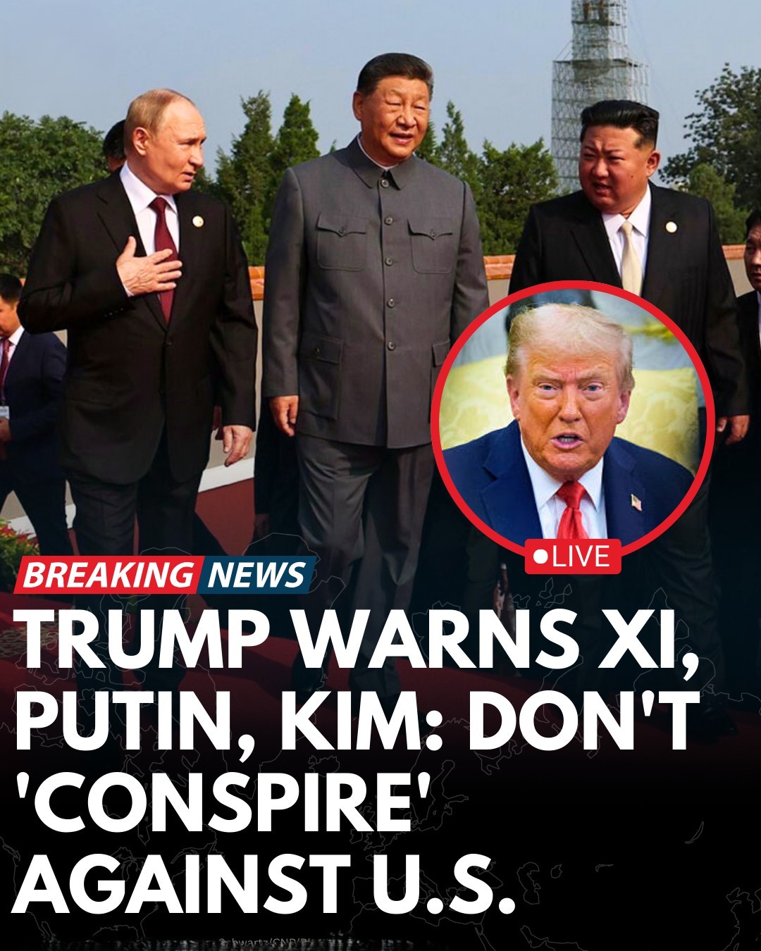“Please give my warmest regards to Vladimir Putin, and Kim Jong Un, as you conspire against The United States of America,” Trump said.