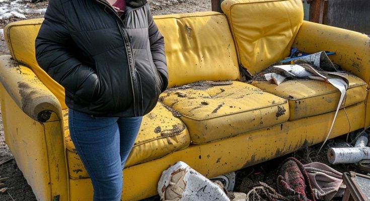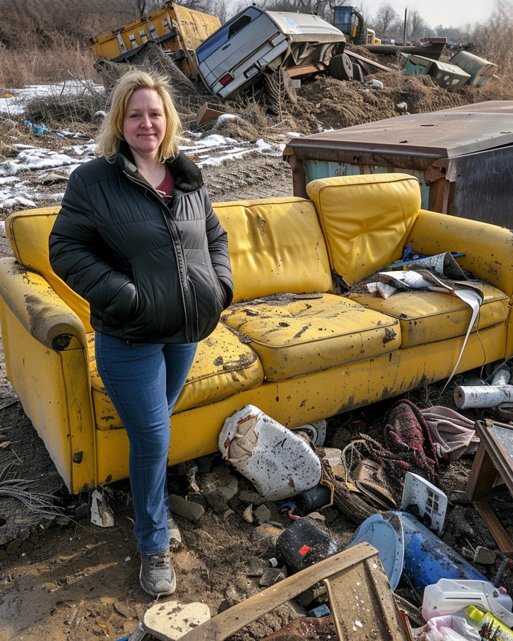 Woman standing next to an old couch in a dumpsite | Source: Midjourney
