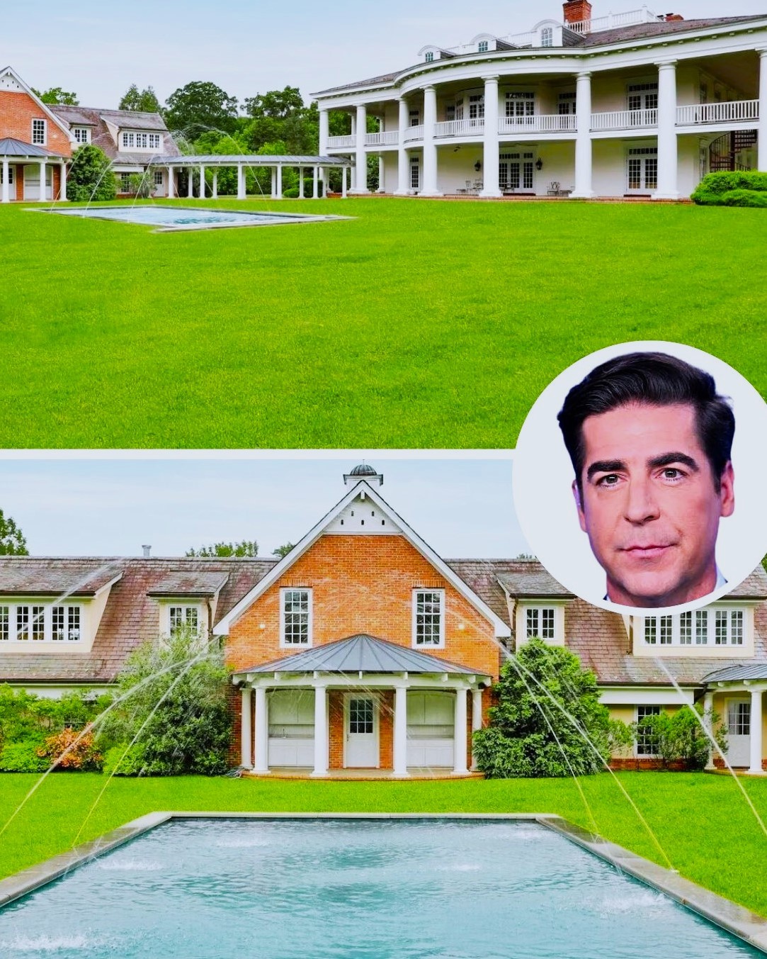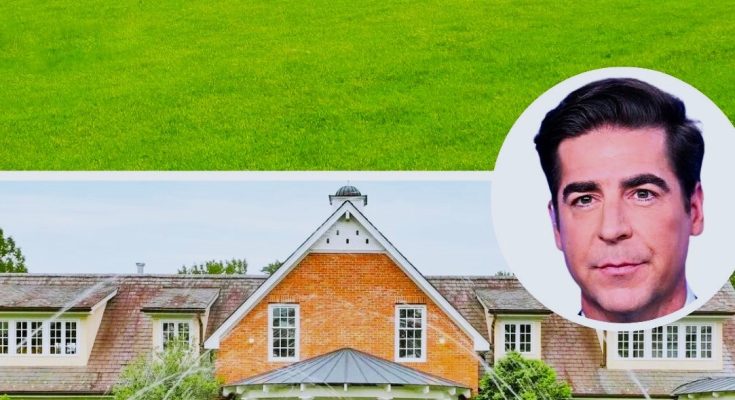 Fox News host Jesse Watters owns a stunning Greek Revival mansion atop Bernardsville Mountain, featuring grand symmetry and expansive wrap-around verandas adorned with Doric columns and French doors.